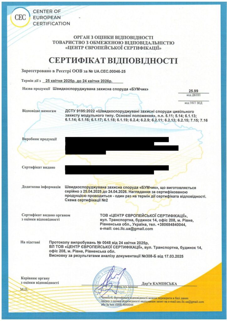 Наявність сертифікатів: це не формальність, а гарантія того, що наші конструкції відповідають заявленим характеристикам та дійсно здатні забезпечити захист під час обстрілів.