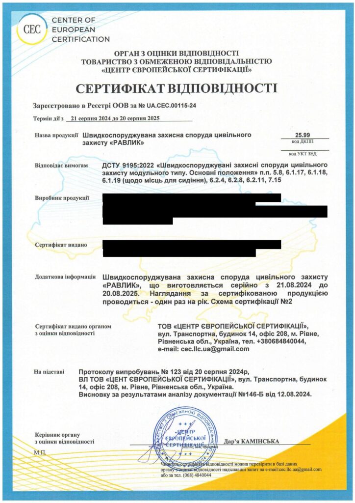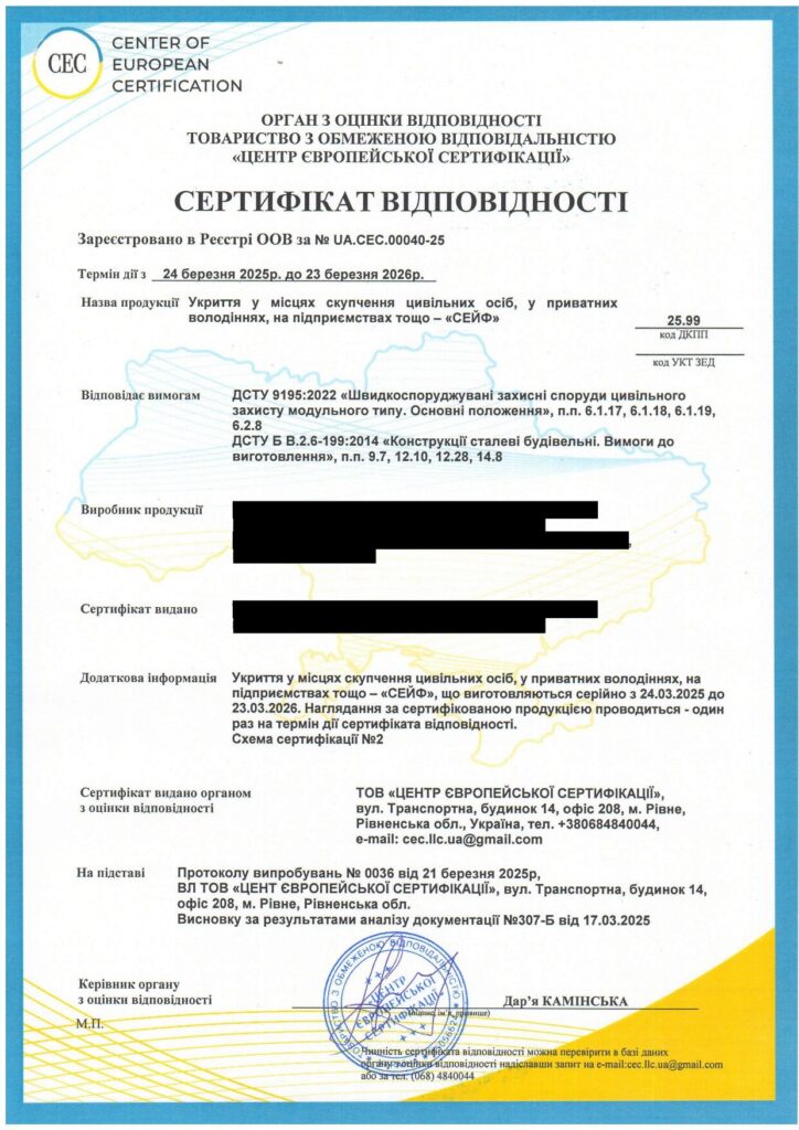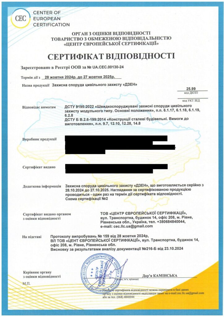 Наявність сертифікатів: це не формальність, а гарантія того, що наші конструкції відповідають заявленим характеристикам та дійсно здатні забезпечити захист під час обстрілів.